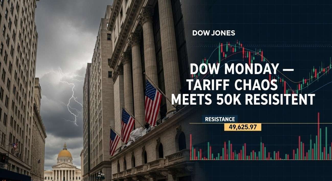 The Dow Jones Industrial Average enters Monday, February 24, 2026 at 49,625.97 — up a modest 0.47% (+230.81 points) on Friday in a volatile session that saw the index whipsaw between gains and losses as investors processed two seismic developments: the Supreme Court’s 6-3 decision striking down President Trump’s reciprocal tariffs as unconstitutional, followed immediately by Trump’s defiant executive order imposing a new 10% global tariff on all imports. The index sits just 374 points (0.75%) below the psychologically critical 50,000 level it briefly touched in early January before retreating, while simultaneously facing headwinds from Friday’s disappointing Q4 GDP print of 1.4% (versus 2.3% expected) and sticky core PCE inflation at 3.0% that keeps the Federal Reserve in hawkish mode. So what should investors expect when US markets open Monday morning — a continuation of Friday’s relief rally toward 50,000, or a reversal lower as tariff uncertainty and economic weakness re-assert themselves?