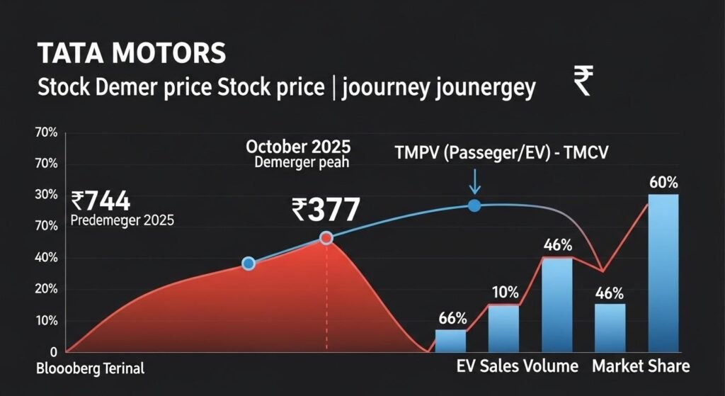 The 49% crash from ₹744 to ₹377 is the headline number that haunts every buy thesis — but context matters. The pre-demerger price reflected both passenger vehicles and commercial vehicles. Post-split, TMPV carries only the PV and EV business, which was loss-making in Q3 FY26 with a ₹3,486 crore net loss. That financial reality explains why the stock trades at book value rather than the premium multiples investors paid when Jaguar Land Rover and commercial vehicle profitability subsidized EV losses.